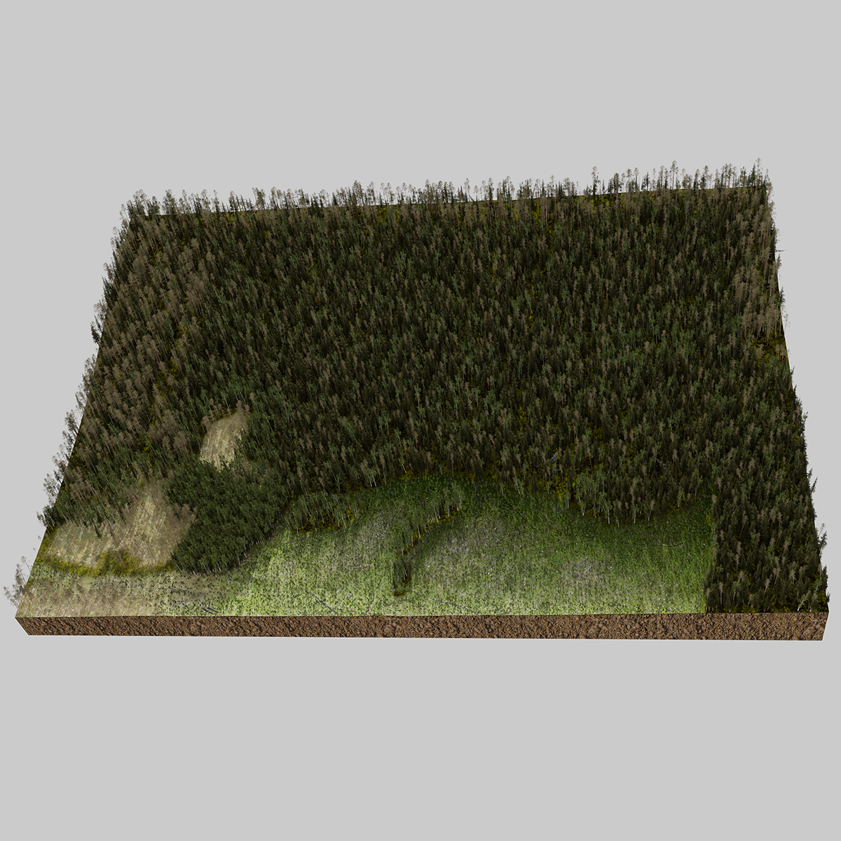 The clear-cut area is 8 hectares in size. This Norway spruce-dominated forest grew on a gentle eastern slope. There were storm-felled trees in several places. In the lower parts of the slope the ground used to be moist and covered with old dead spruces. In these places the vulnerable fungi Phlebia centrifuga was found, a species of crust fungus in the family Meruliaceae. Also, the rare and nearly threatened Rhodofomes roseus was found in these places. After the felling, there were major ground damages from the heavy harvesting machines. The forest was logged by an FSC-certified forestry company.